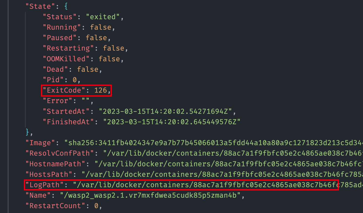 - ExitCode: The reason why a container exit. You can check this page for more specific exitcode. It is always a error summary. For 126, it means that a command used in the container specification could not be invoked.