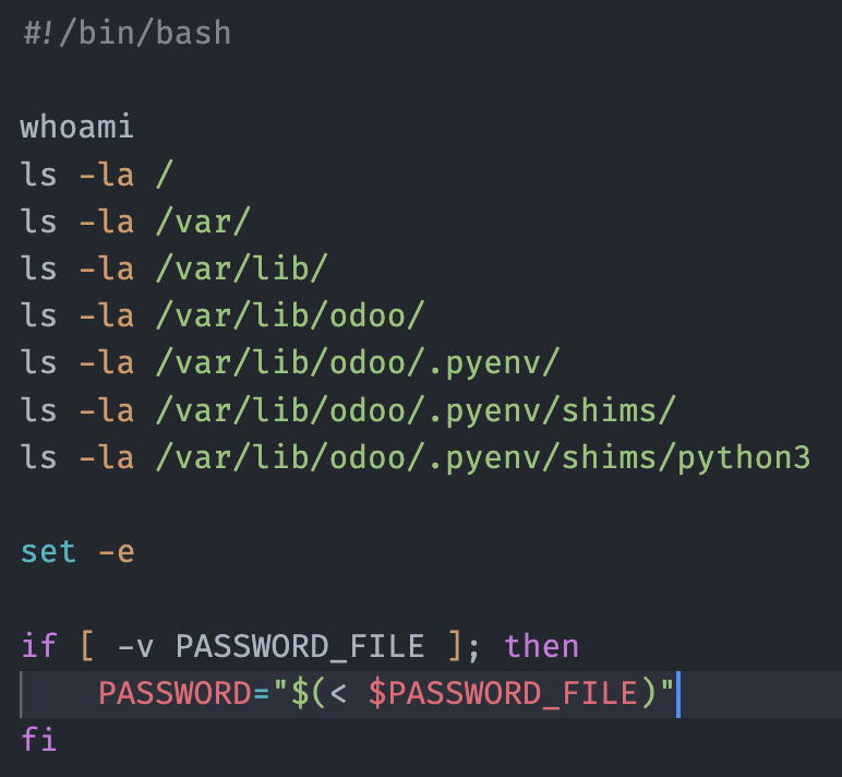 As the docker is run by the command “/entrypoint.sh odoo”, I need to debug by putting some output in the entrypoint.sh to see what is going on.