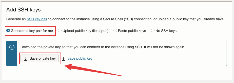 Save your private key, which you will use to login your machin by ssh.