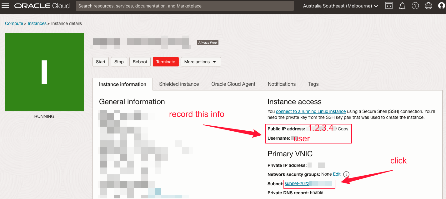 When your machine is running, you should be able to get its public ip address and user name, which you will use to ssh your cloud server.