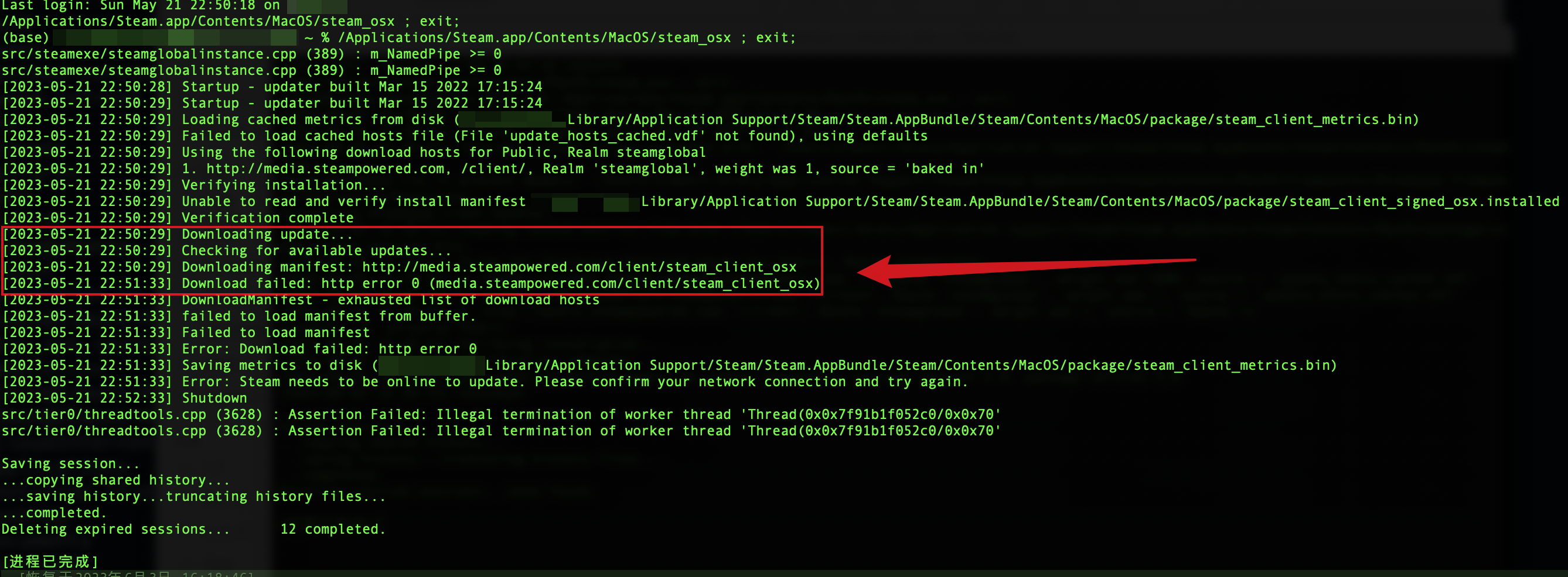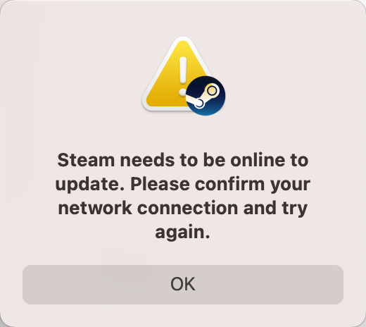 One day after I reinstalled my steam on my Mac, my steam couldn’t be opened anymore 😭. Every time I try to start my steam, it will show that it need to update and after a few minutes it pop up the error message like this.