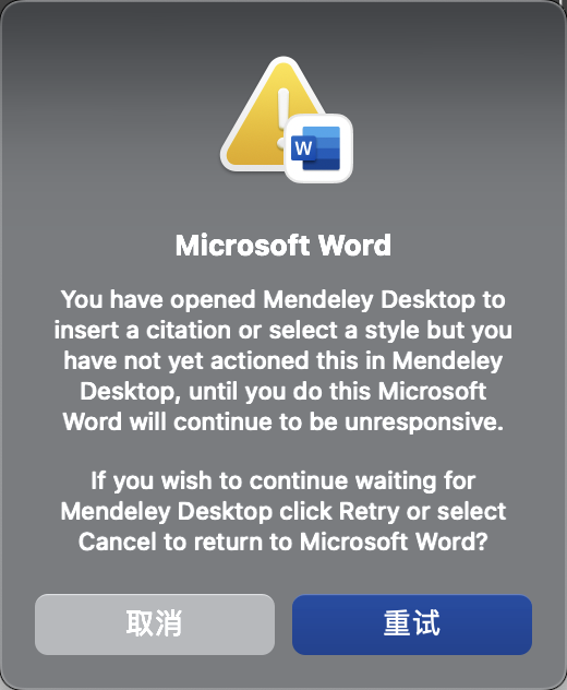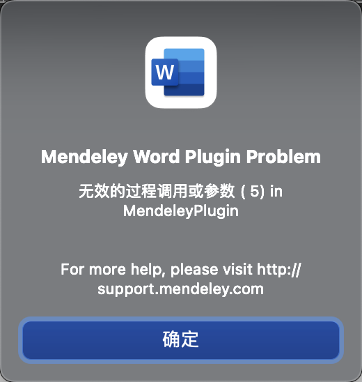 我这里使用的是AppCleaner直接删除的Mendeley,想着删除完就好了,没想到删除了之后word一直在报各种异常(如下),因此才有后续的步骤。