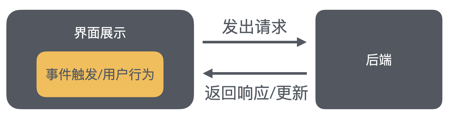 而又因为我们希望这个系统更加智能,那信息展示就需要具备实时性,我们就需要引入请求和相应模块:我们需要通过用户的某些行为(如点击按钮),来触发一个发到后端的请求(如查询当前在职人数),进而利用请求所返回的响应,刷新当前的界面,让用户能够看到最新的信息(如此时此刻的当前在此人数)。