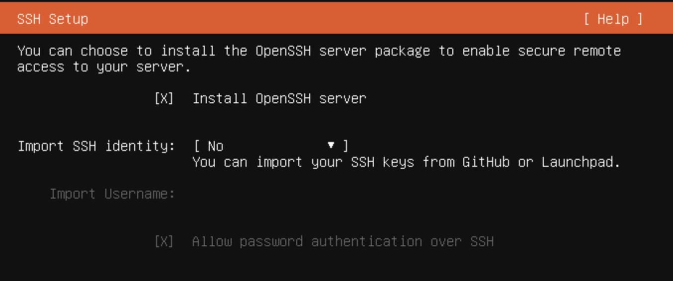 如果你想关闭ssh的密码登录功能,那只需要修改Import SSH identity为Yes,然后选择Github或者Launchpad账户。这个操作会将账户上记录的公钥作为本机的认证手段,因此只有持有与账户上的公钥对应的私钥的设备才能连接上本机。
